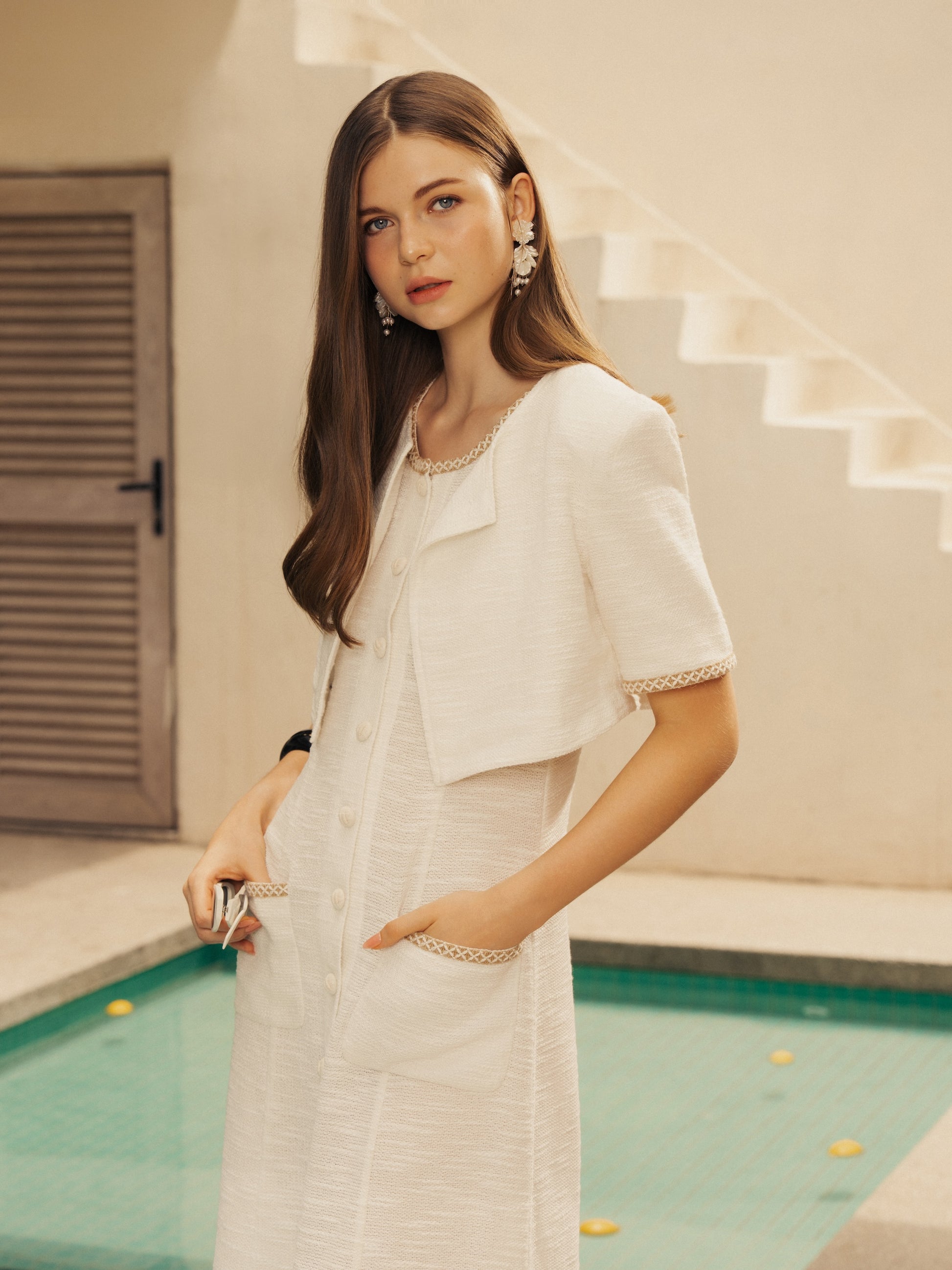 This refined sleeveless dress re-imagines classic tailoring with a modern sensibility. Defined by clean lines and utilitarian patch pockets, its minimal silhouette is elevated by a textural fabric that conveys understated luxury.
