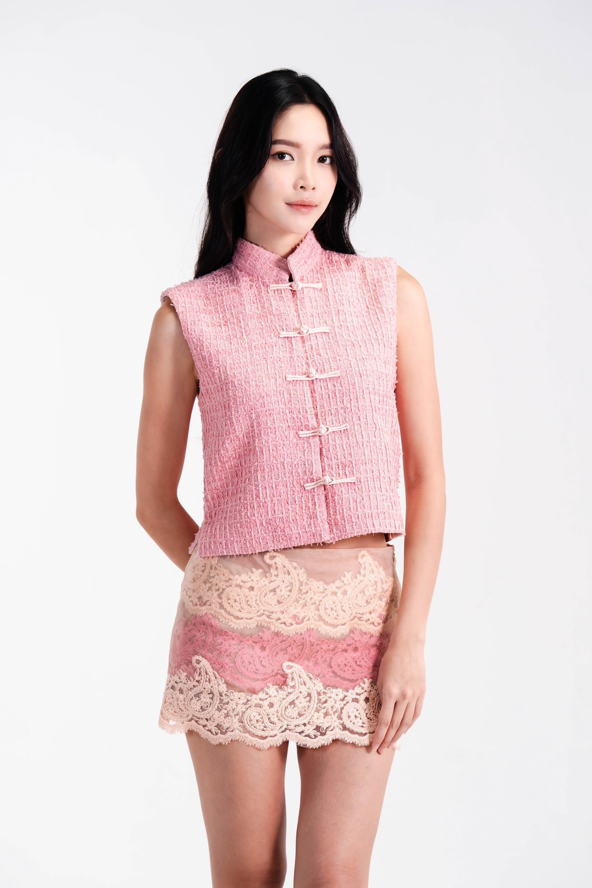 A sugar-spun vest in rosy tweed, sweetened with dainty knots and a mandarin collar to finish.